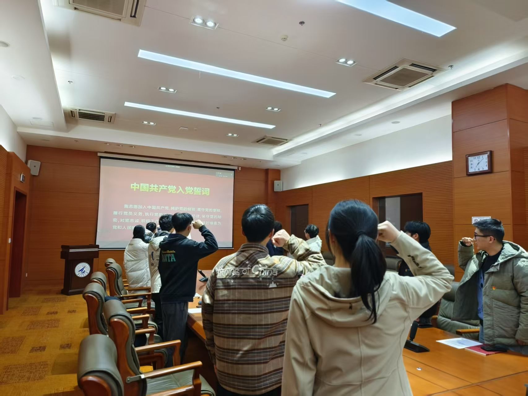 会议开始,新发展党员进行入党宣誓,其他党员重温入党誓词。全体党员紧握右拳,庄严宣誓,呼喊出对党忠诚、为党献身的光荣誓言。