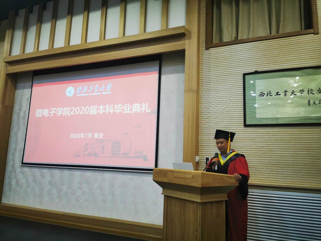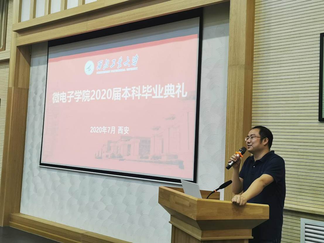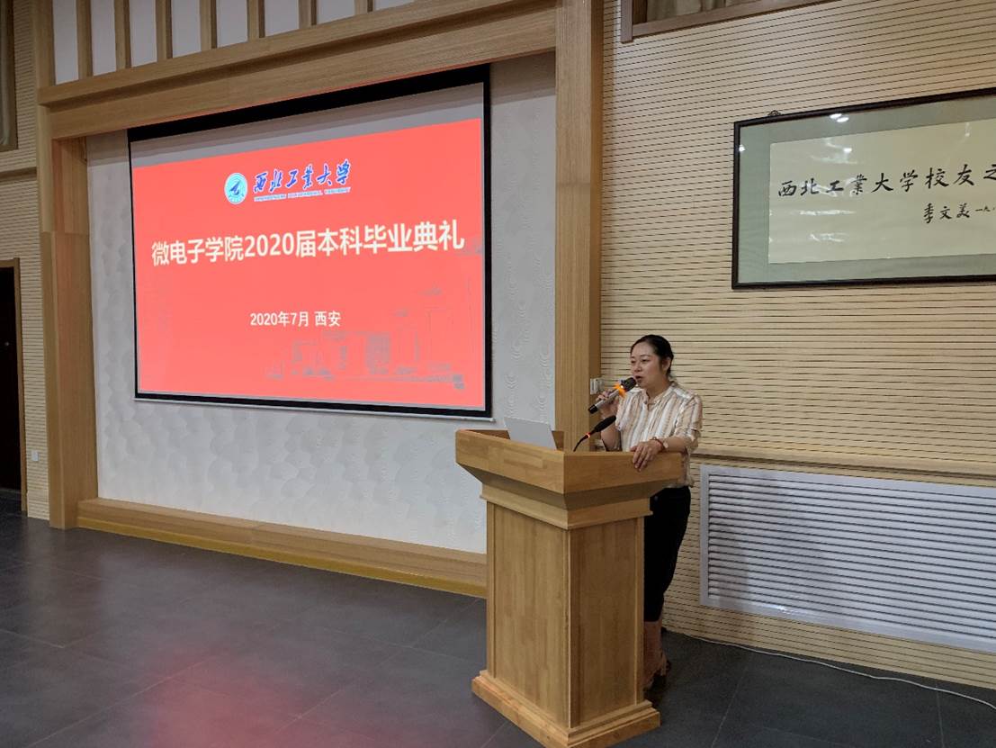 2020届本科毕业典礼暨学位授予仪式在友谊校区阶二会议厅举行,祝贺全体微电子本科毕业生圆满完成学业任务,获得学士学位。学院副院长王少熙,党委副书记彭蓉,教师代表马彦昭、毕业班辅导员阴玥和全体本科毕业生参加毕业典礼,辅导员阴玥主持仪式现场。