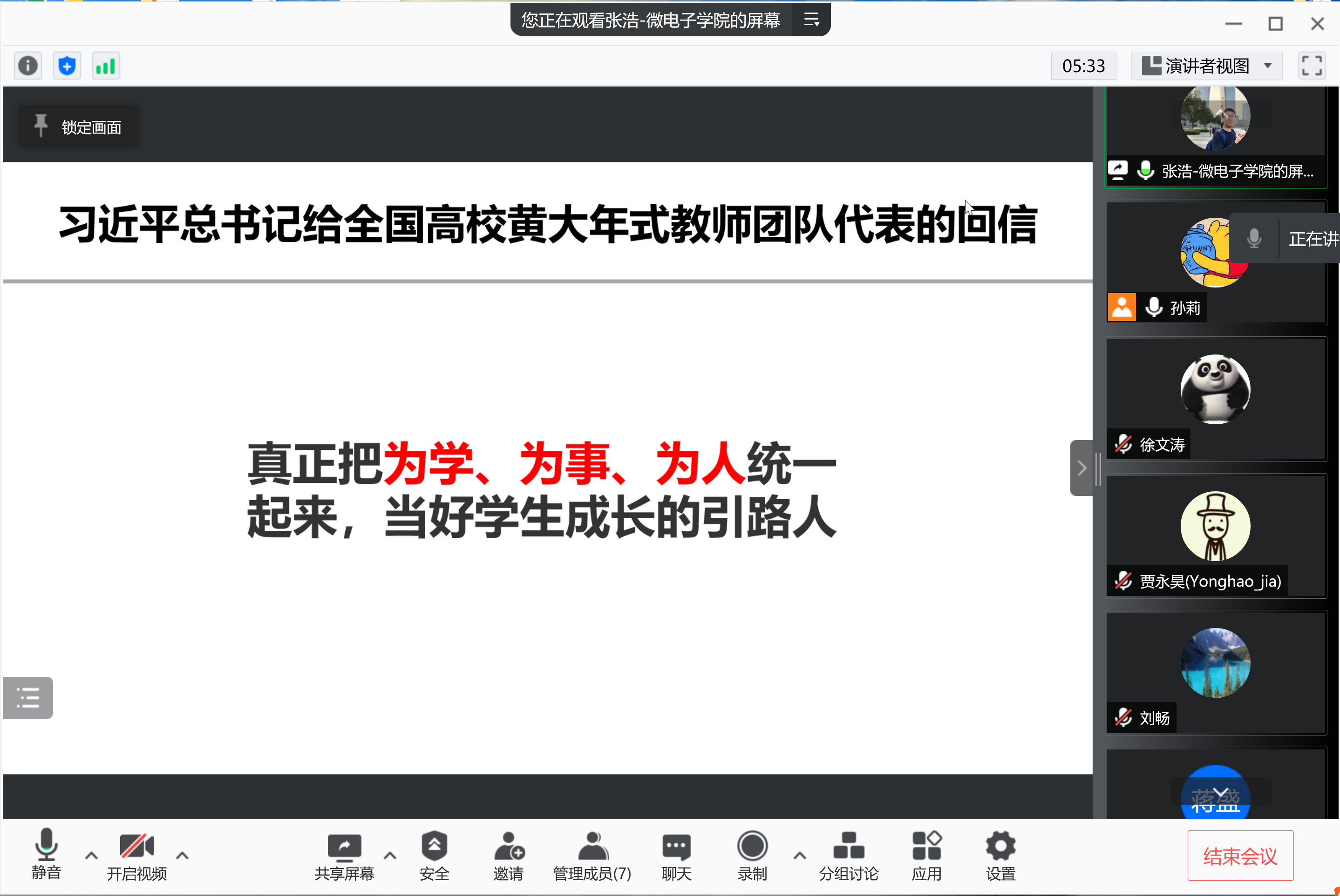本次支部党史学习教育研讨活动由支部党员张浩带领深入学习贯彻习近平总书记给全国高校黄大年式教师团队代表的回信精神。高校教师要真正把为学、为事、为人统一起来,要当好学生成长的引路人。在学习习近平总书记在陕西省榆林市考察时的重要指示精神时,张浩老师建议各位党员老师充分运用红色资源,深化党史学习教育,也建议将课程思政融入专业基础教育中。通过学习习近平总书记在中央人才工作会议上的重要讲话精神,明确了深入实施新时代人才强国战略的指导思想、战略目标、重点任务、政策举措。同时明确“八个坚持”,并学习了习近平总书记对新时代人才工作的新理念、新战略和新举措。之后,支部党员结合工作学习实际,开展研讨交流。通过此次党史学习教育研讨,各位党员同志对自己的高校教师的职责有了更深入的理解,也为自己未来的工作树立了标杆和方向。