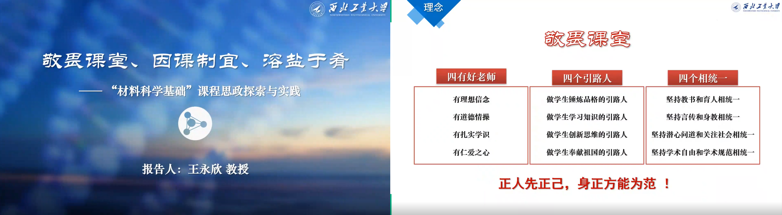 王永欣副院长还以“敬畏课堂、因课制宜、溶盐于肴——‘材料科学基础’课程思政探索与实践”为主题结合材料学专业特色向我院教师传授了课程思政课堂方面的经验。以课题的背景与理念、课程概况、规划与实践三个方面进行了介绍,并指明了课程思政教学中存在的主要问题,针对课程思政课程中存在的主要问题,提到教师要敬畏课堂,因课制宜,溶盐于肴,以“四有好老师”“四个引路人”“四个相统一”为指导思想进行思政课程教学,思政课程元素要达到求真、达善、合美的目标。
