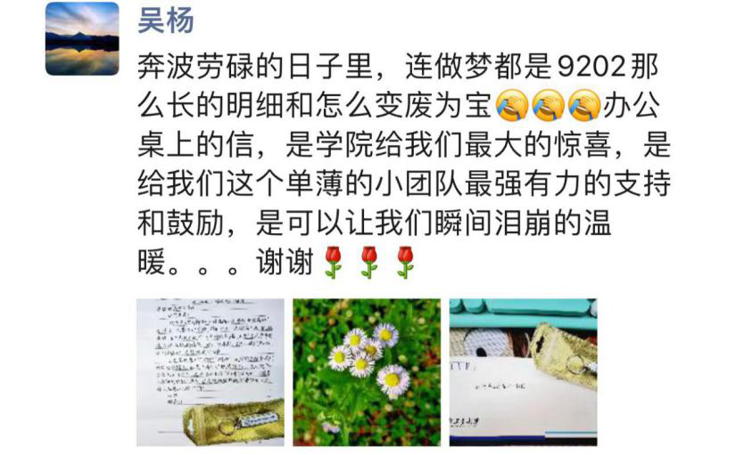 你们好,今天下午我们收到了微你们送来的感谢信和小礼物,下午办公室有点忙碌,所以没有好好感谢一下同学们,帮我们转达一下谢意。非常感谢同学们的心意,特别特别的温暖。之前做的工作,能让同学们认可和支持,我们也很开心。这份心意也让我们更加有动力,我们会继续为同学们做好保障工作。再次感谢可爱的同学们,还有学院的这次暖心组织。