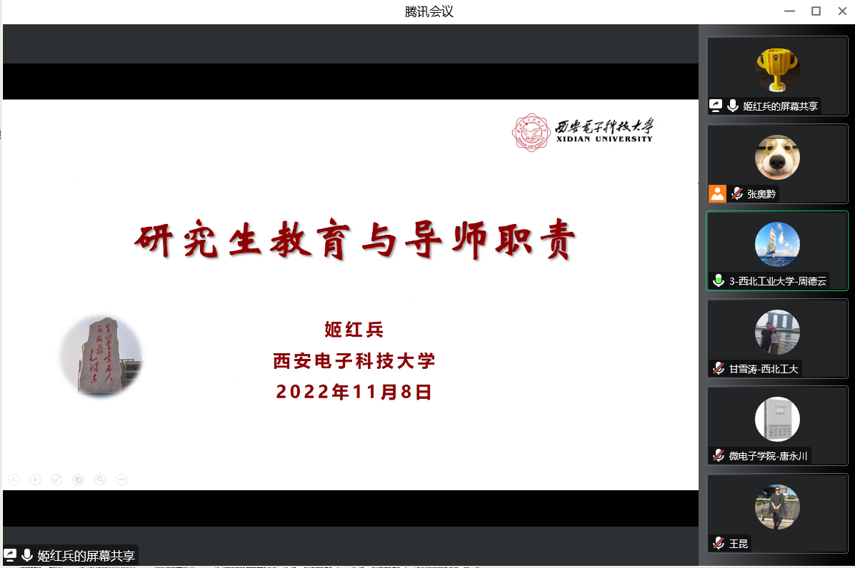 召开导师培训会,培训通过线上形式进行。本次培训会由西安电子科技大学研究生院副院长姬红兵讲授,我院全体研究生导师参会。会议由学院院长周德云主持。