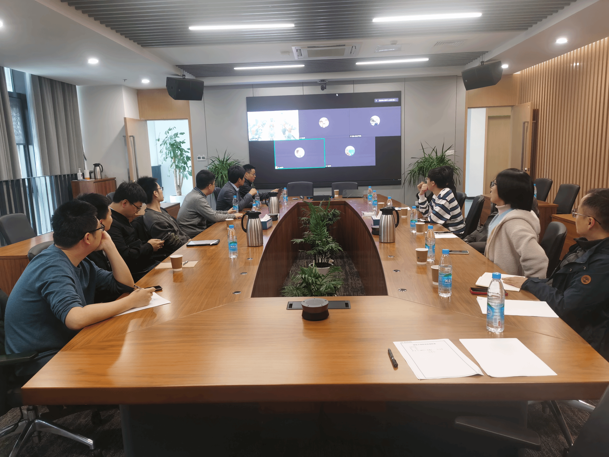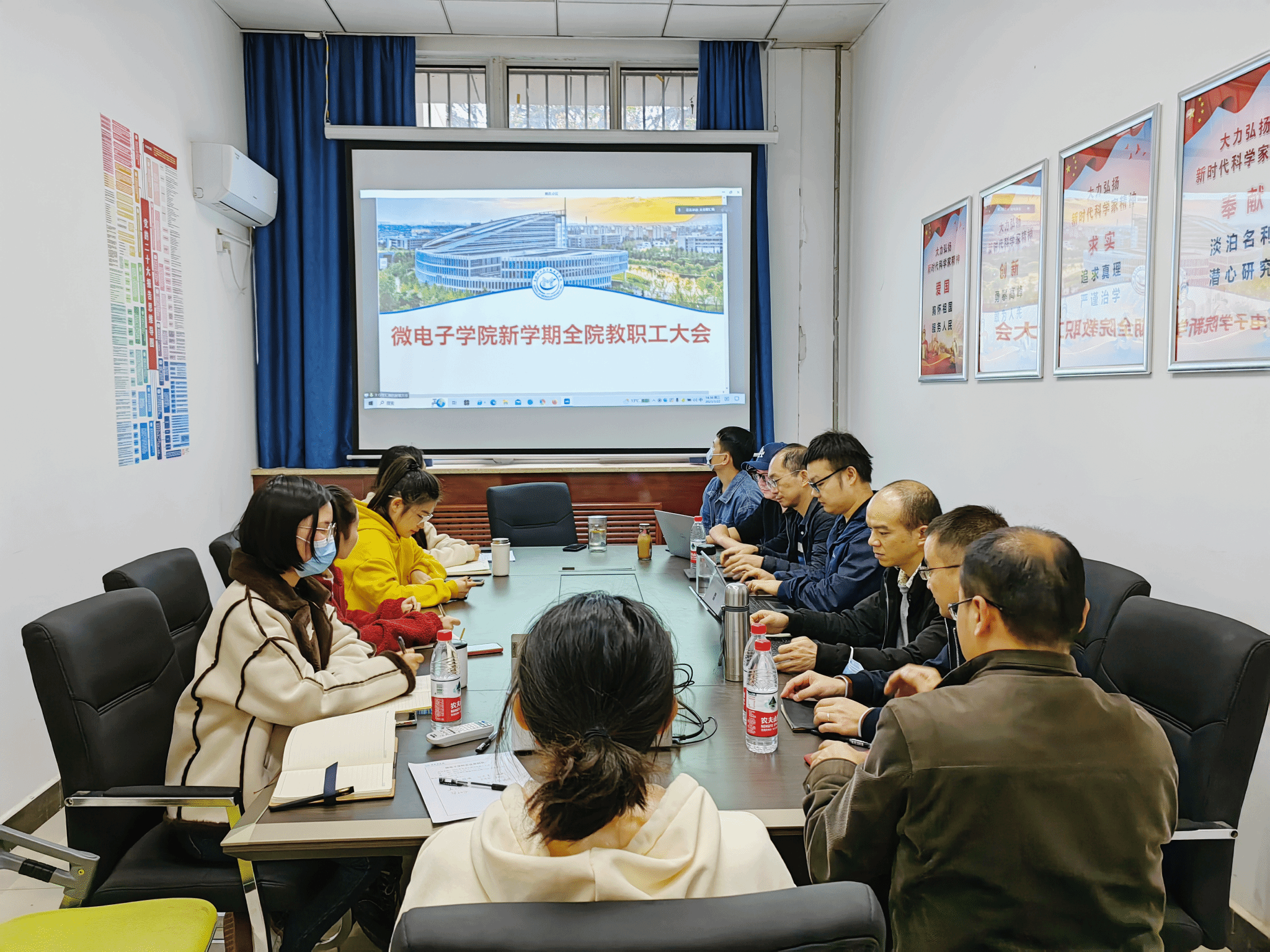 在太仓智汇港教学综合体C702召开新学期全体教职工大会,西安教职工在学院楼140会议室线上参加。会议由学院党委书记甘雪涛主持。